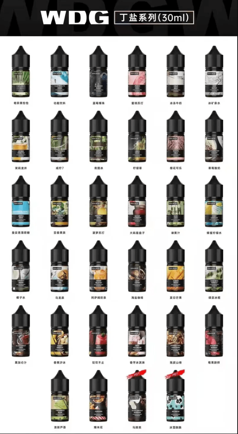 多樣化口味 :WDG 煙油擁有多款創新的口味,如 Fresh Berry(新鮮莓果)、Vanilla Custard(香草奶油)、Tobacco Menthol(薄荷煙草)、奇異果恰恰果、阿薩姆奶茶、咸寧 7、冰礦泉水、蜜桃蘇打等,無論是水果風味、甜品口感還是煙草香氣,都能滿足不同人的偏好。
